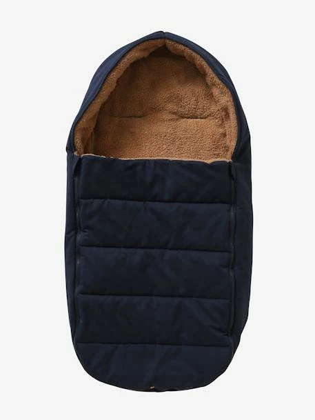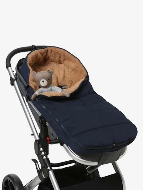 Footmuff for pushchair in water-repellent fabric: 50% cotton, 41% polyester, 9% polyamide. Plush lining in polyester.