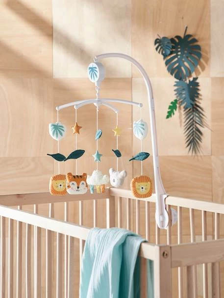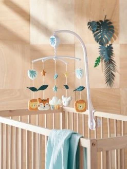 A lovely musical mobile where jungle animals get together to soothe baby in his cradle or cot. While watching the tiger, the lion and the koala, your little darling will marvel and fall asleep to the sound of soft music! Comes in a pretty box, this musical mobile is a really great gift idea!