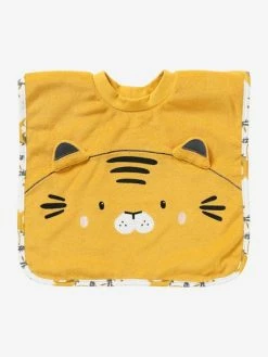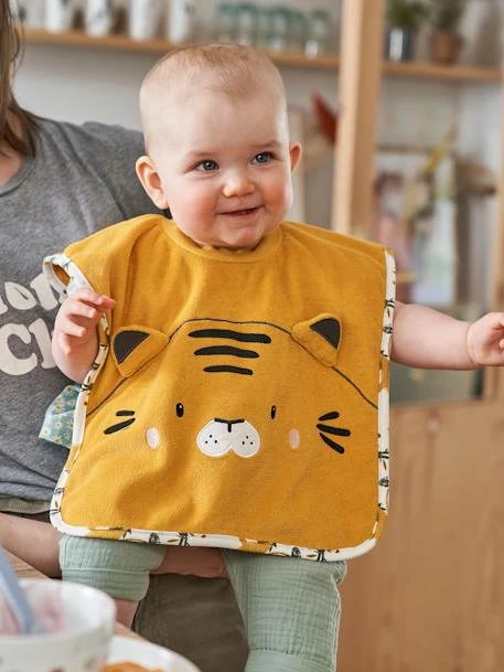 An extra large bib that protects clothes very well during mealtimes! Decorated with a small animal face with flapping ears and a lovely printed bias, your child will love slipping it on!