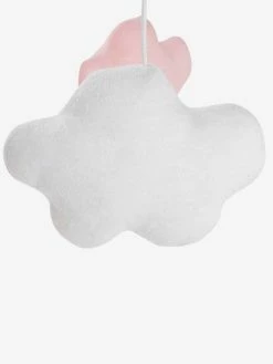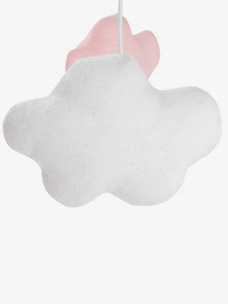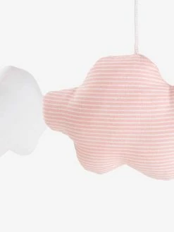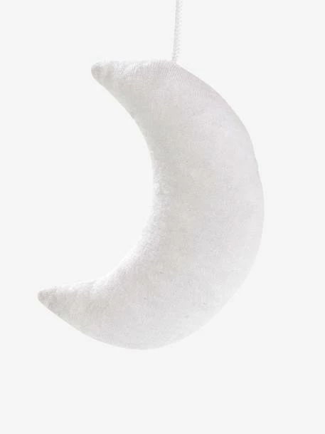 - 5 elements in printed padded fabric, 100% polyester: 1 crescent moon + 2 clouds in jersey knit with white polka dots and 2 clouds with white/pink cotton stripes.